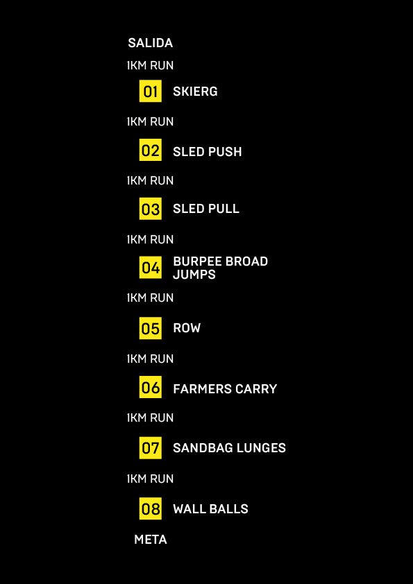 HYROX es una competición que combina 8 kilómetros de carrera con 8 workouts. El formato siempre es el mismo: recorrerás 8 km de carrera, alternando cada kilómetro con un workout diferente, hasta la meta.